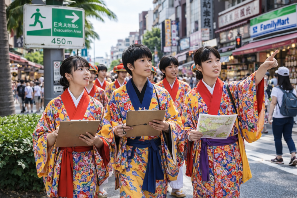 琉球衣装をまとうことにより動きが制限され、観光地で人が多く、視線も集まり「普段通りに動けない状態」が災害時と同じ条件となり、防災を“自分事”にできます。また制服や私服では気づかないことが、衣装を着ることにより階段・段差はどうか混雑時にすぐ動けるか、トイレ・休憩場所は十分かなど観光防災の本質を体感できます。
